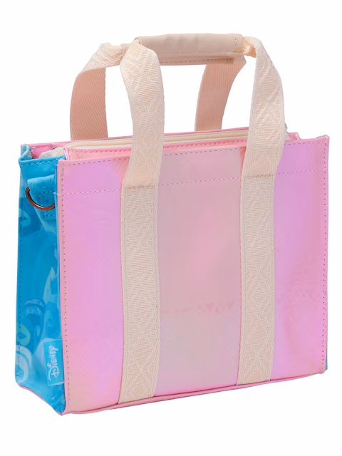 Pack for island adventures with this fabulous shoulder bag! Featuring a shimmery pink iridescent material and two zipped compartments, perfect for taking essentials on day trips across the ocean! Check out the beautiful coconut-scented badge, embroidered strap details and fabric top handles.