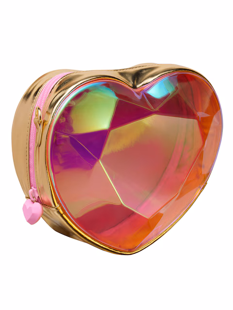 Carry essentials in style with our Radiant Shoulder Bag! This iridescent bag features an adjustable metallic gold strap, main compartment and secure zipped pocket inside. Plus check out the stunning transparent, solid 3-D heart shape on the front, and additional heart-gem zip details!
